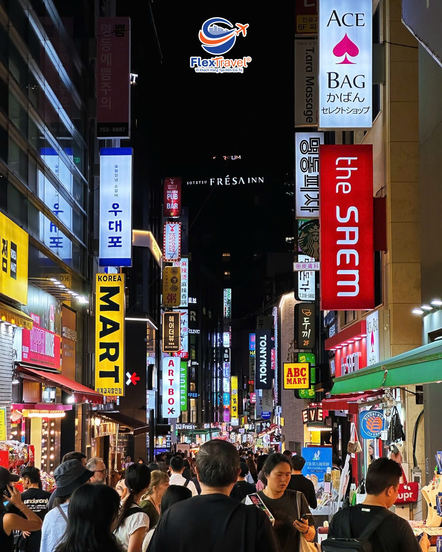 Tối: Đoàn dùng bữa tối tại nhà hàng địa phương sau đó về Khách sạn nghỉ ngơi hoặc tự do đi tham quan mua sắm tại Chợ Myeongdong ở Seoul là khu mua sắm bán buôn và bán lẻ lớn nhất Hàn Quốc (chi phí tự túc).