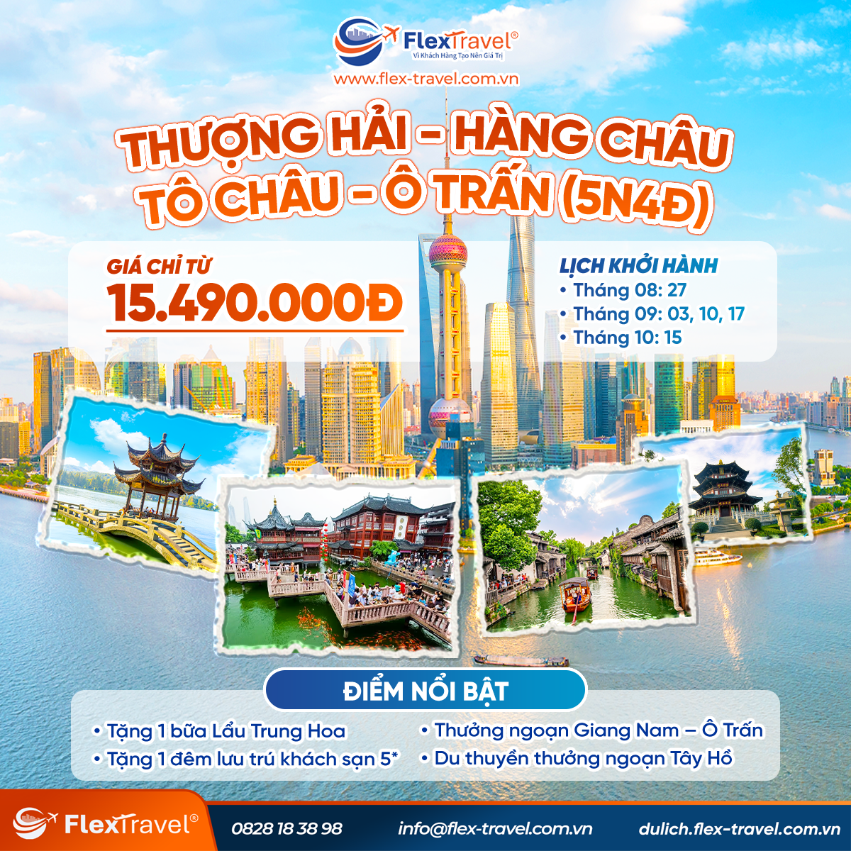 Tour du lịch Thượng Hải – Tô Châu – Hàng Châu – Ô Trấn 5N4Đ là hành trình hấp dẫn đưa du khách khám phá những điểm đến nổi bật nhất miền Đông Trung Quốc. Tại Thượng Hải, bạn sẽ cảm nhận nhịp sống sôi động nơi Bến Thượng Hải, chiêm ngưỡng Tháp Truyền Hình Minh Châu Đông Phương và dạo bước trên phố Nam Kinh rực rỡ ánh đèn.